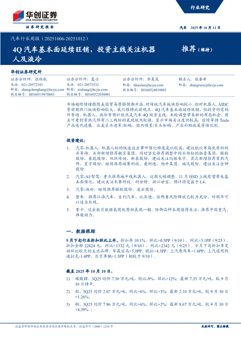 汽车行业:华创证券-汽车行业周报:4Q汽车基本面延续旺销,投资主线关注机器人及液冷-251012