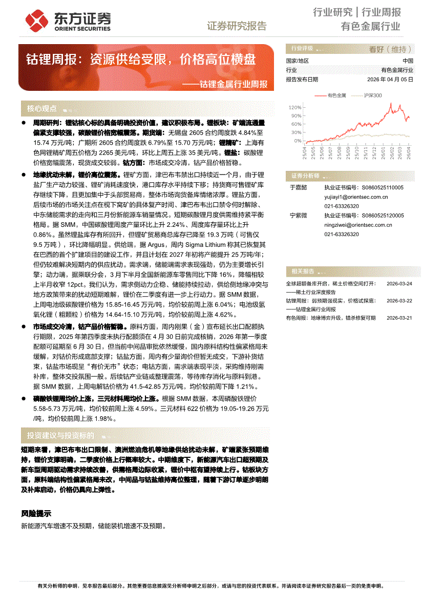 有色金属行业:东方证券-钴锂金属行业周报:钴锂周报,资源供给受限,价格高位横盘-260405
