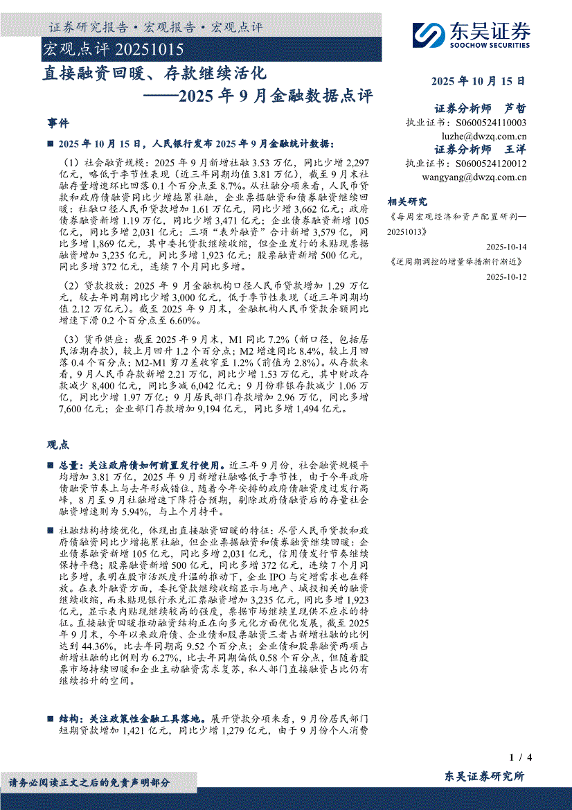 东吴证券-2025年9月金融数据点评:直接融资回暖、存款继续活化-251015