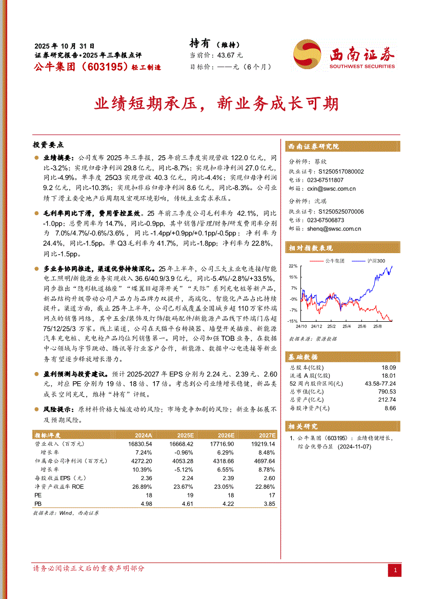公牛集团:西南证券-公牛集团-603195-业绩短期承压,新业务成长可期-251031