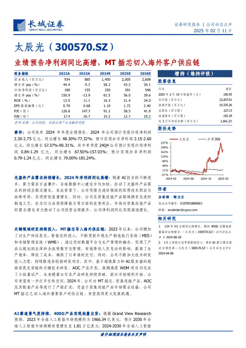 太辰光:长城证券-太辰光-300570-业绩预告净利润同比高增,MT插芯切入海外客户供应链-250211