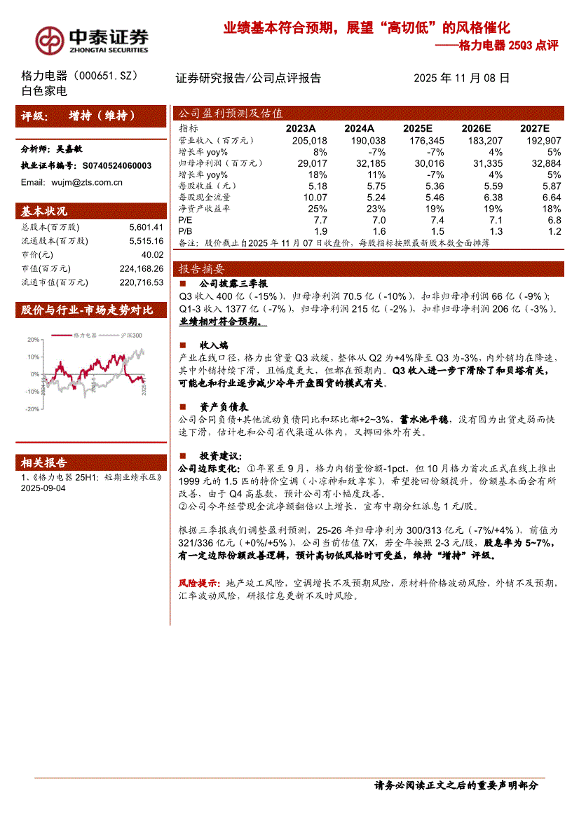 格力电器:中泰证券-格力电器-000651-25Q3点评:业绩基本符合预期,展望“高切低”的风格催化-251108