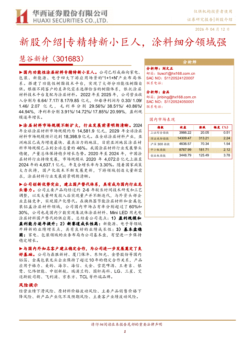 慧谷新材:华西证券-慧谷新材-301683-新股介绍|专精特新小巨人,涂料细分领域强-260412