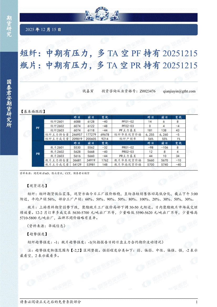 国泰君安期货-短纤:中期有压力,多TA空PF持有,瓶片,中期有压力,多TA空PR持有-251215