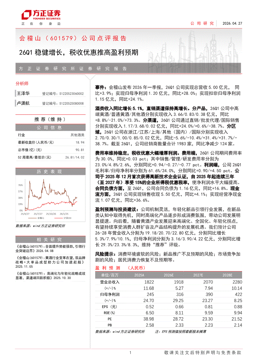 会稽山:方正证券-会稽山-601579-公司点评报告:26Q1稳健增长,税收优惠推高盈利预期-260427