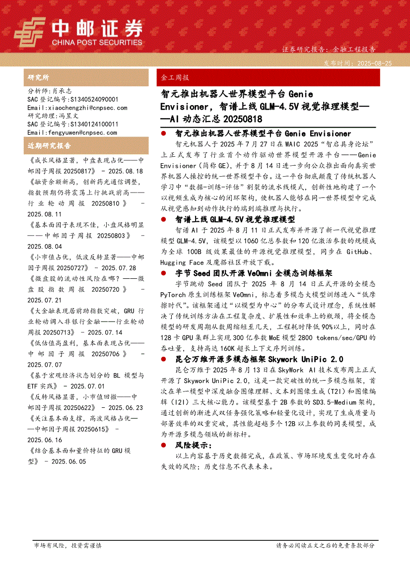 中邮证券-AI动态汇总:智元推出机器人世界模型平台Genie Envisioner,智谱上线GLM~4.5V视觉推理模型-250825