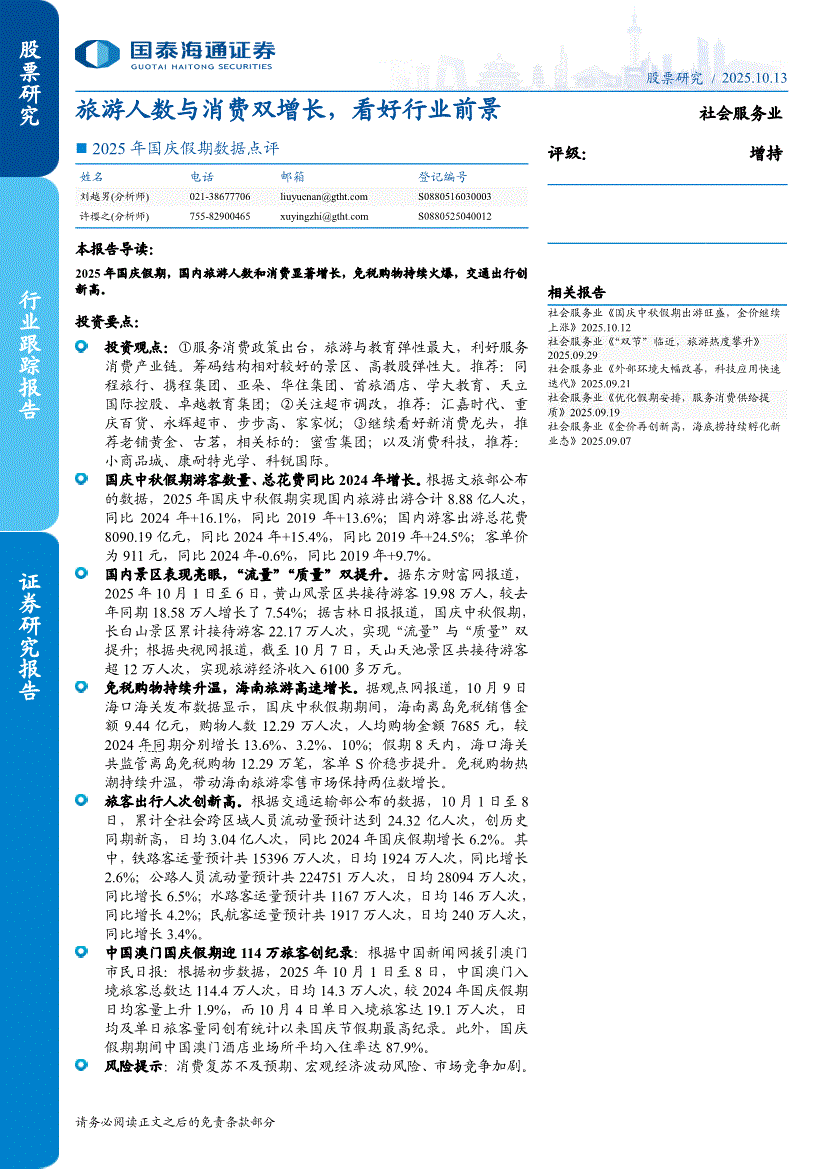 社会服务行业:国泰海通证券-社会服务行业2025年国庆假期数据点评:旅游人数与消费双增长,看好行业前景-251013