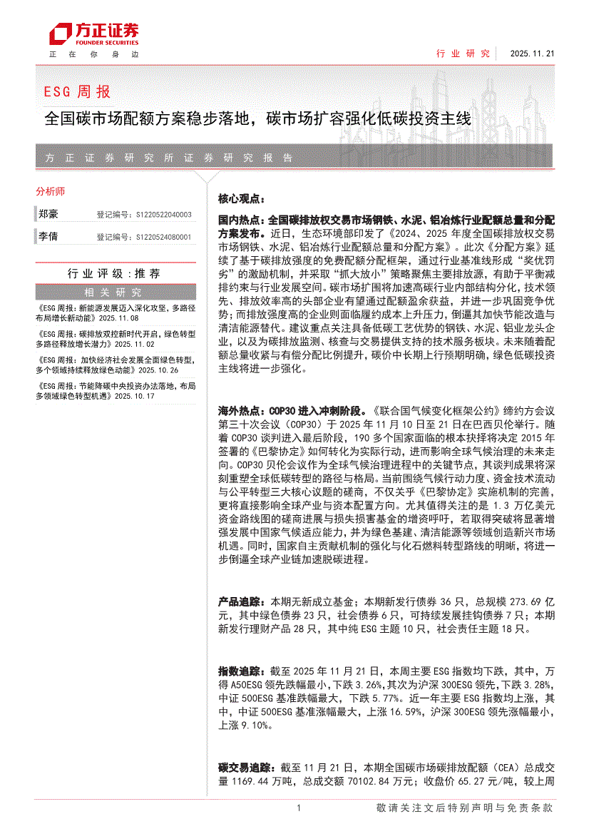 ESG行业:方正证券-ESG行业周报:全国碳市场配额方案稳步落地,碳市场扩容强化低碳投资主线-251121