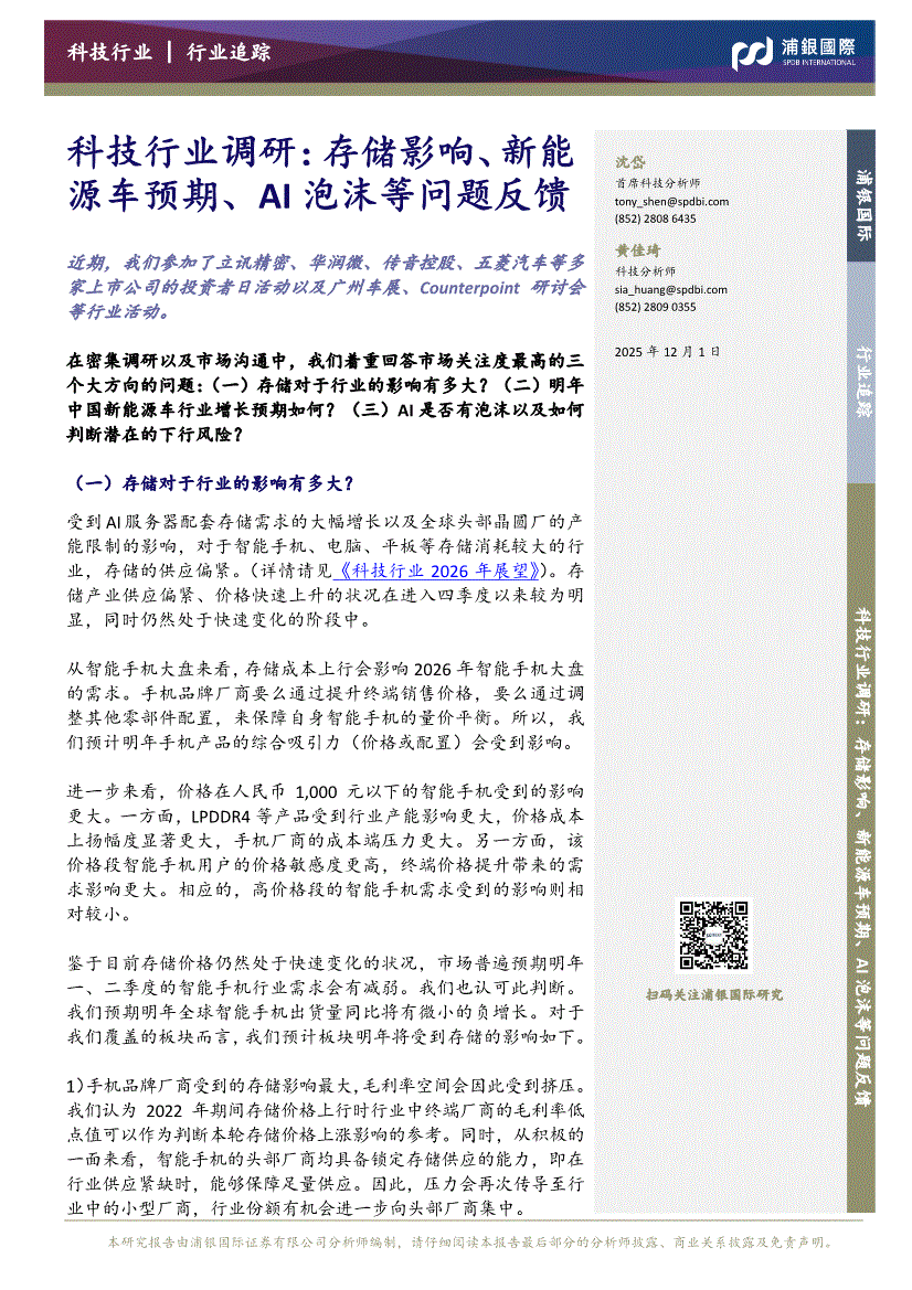 科技行业:浦银国际-科技行业调研:存储影响、新能源车预期、AI泡沫等问题反馈-251201
