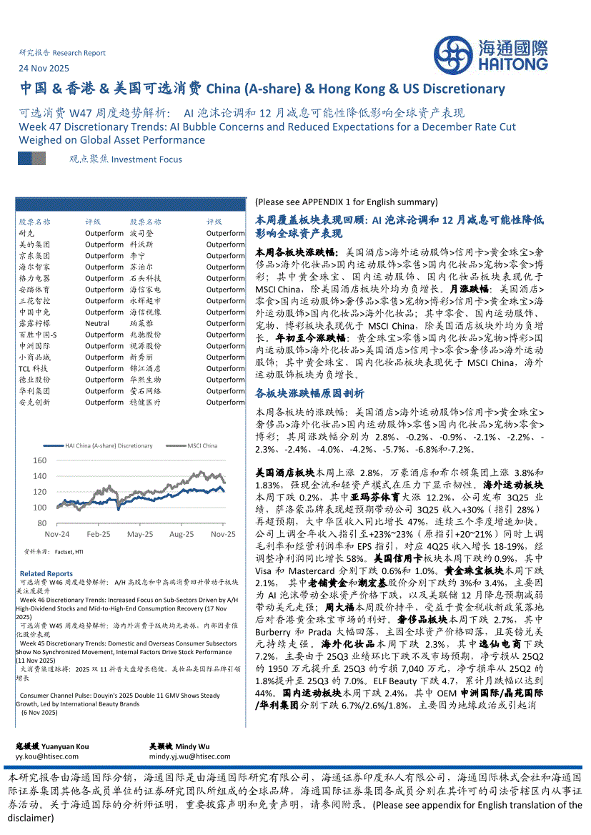 可选消费行业:海通国际-中国&香港&美国可选消费行业:可选消费W47周度趋势解析,AI泡沫论调和12月减息可能性降低影响全球资产表现-251124