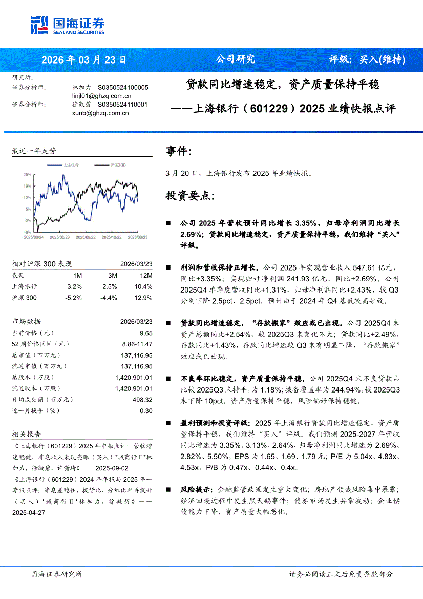 上海银行:国海证券-上海银行-601229-2025业绩快报点评:贷款同比增速稳定,资产质量保持平稳-260323