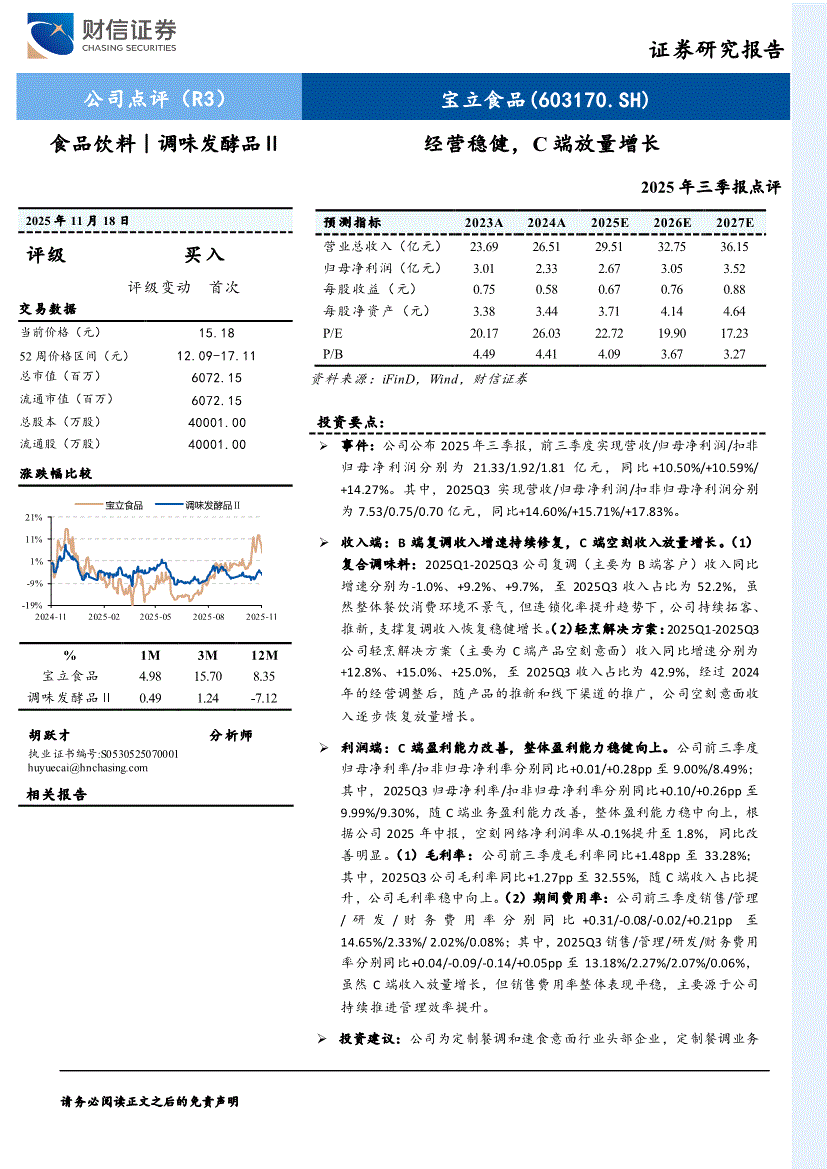 宝立食品:财信证券-宝立食品-603170-2025年三季报点评:经营稳健,C端放量增长-251118