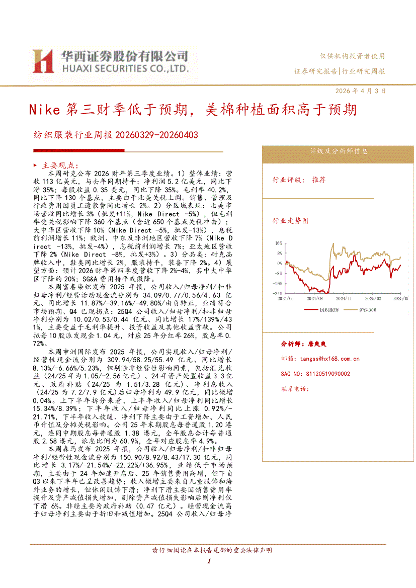 纺织服装行业:华西证券-纺织服装行业周报:Nike第三财季低于预期,美棉种植面积高于预期-260403
