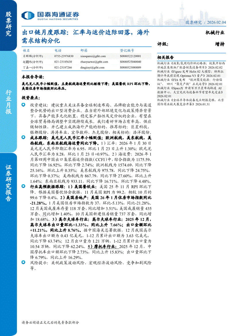 机械行业:国泰海通证券-机械行业出口链月度跟踪:汇率与运价边际回落,海外需求结构分化-260204