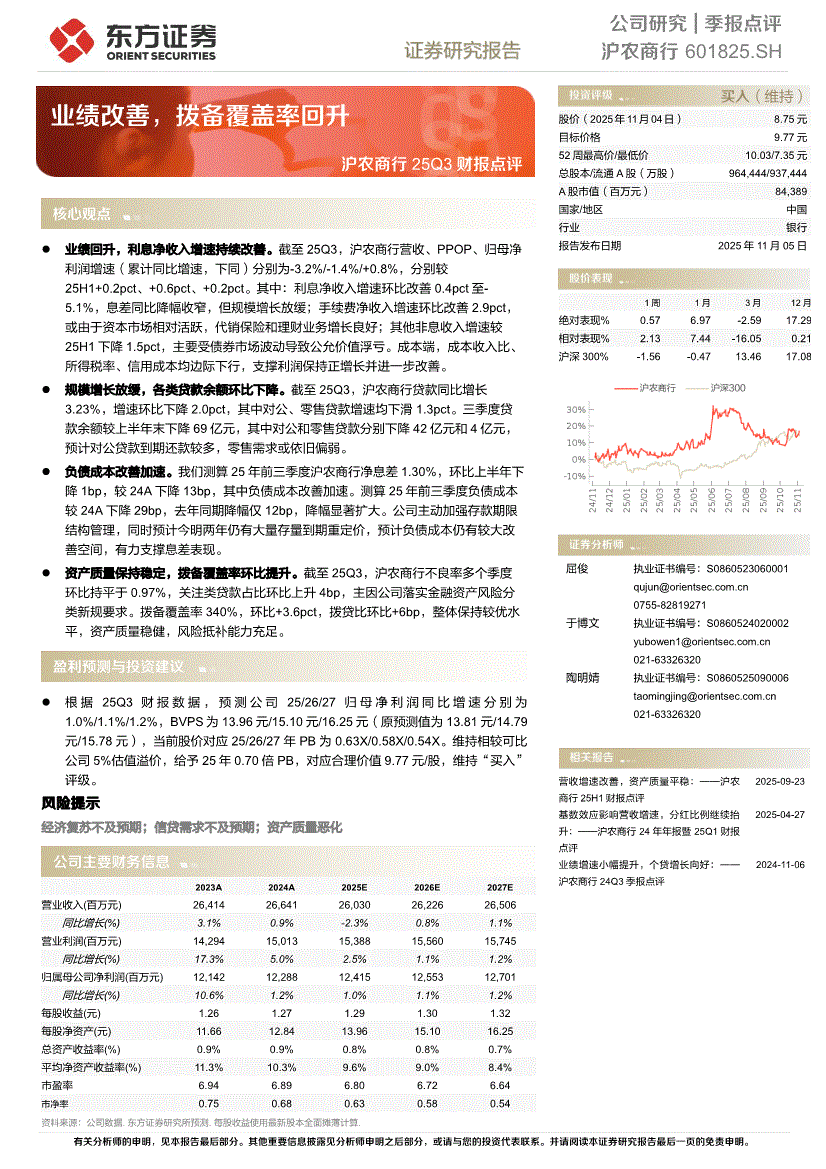 沪农商行:东方证券-沪农商行-601825-25Q3财报点评:业绩改善,拨备覆盖率回升-251105