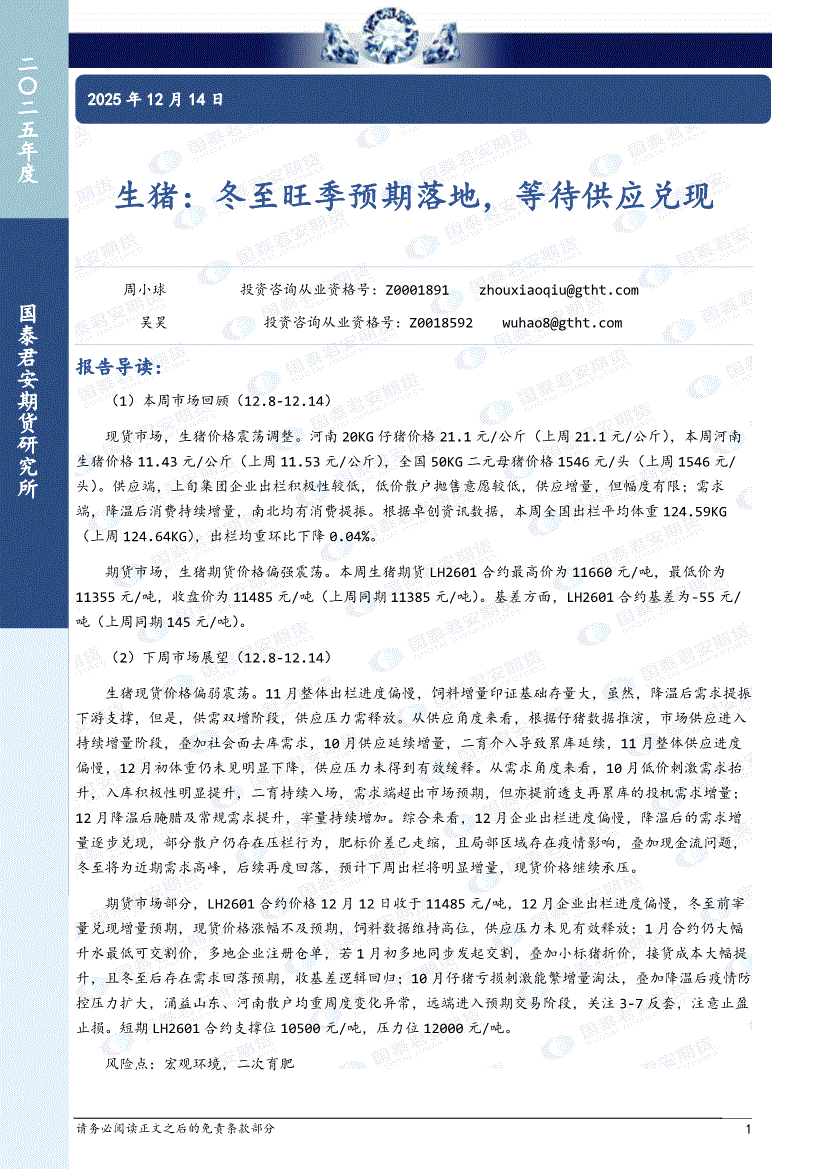 国泰君安期货-生猪:冬至旺季预期落地,等待供应兑现-251214