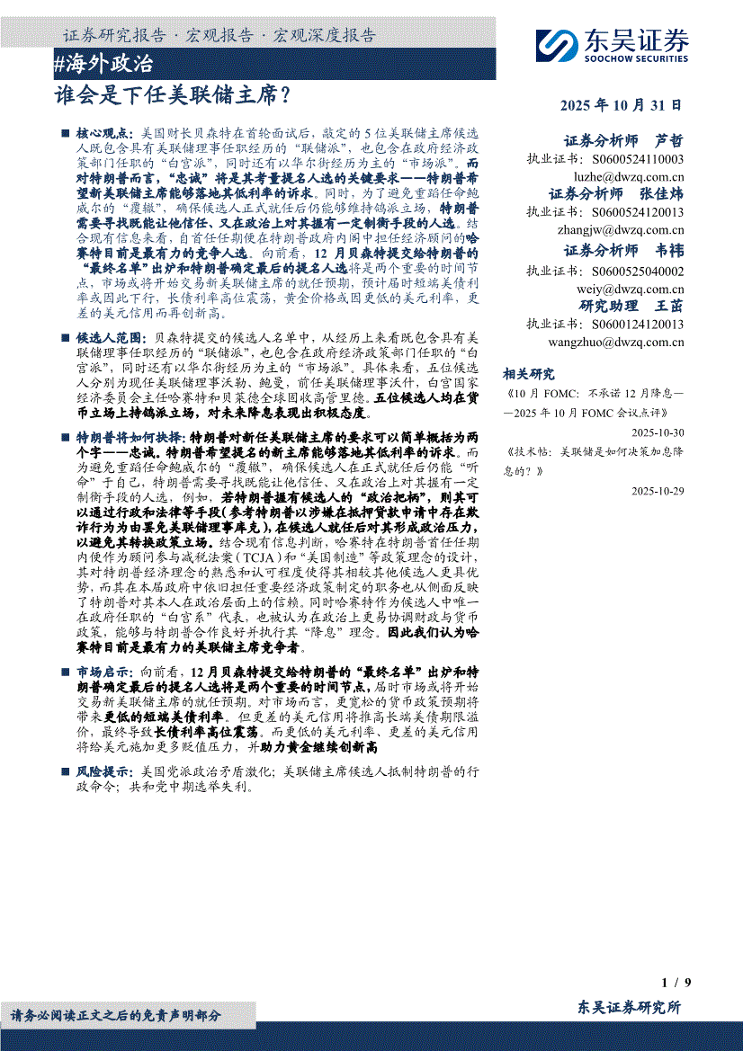 东吴证券-宏观深度报告:海外政治,谁会是下任美联储主席?-251031