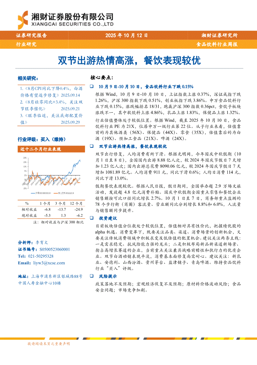 食品饮料行业:湘财证券-食品饮料行业周报:双节出游热情高涨,餐饮表现较优-251012