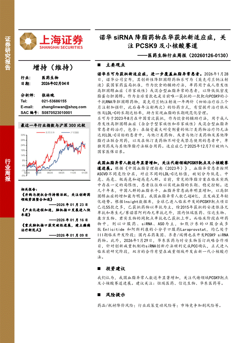 医药生物行业:上海证券-医药生物行业周报:诺华siRNA降脂药物在华获批新适应症,关注PCSK9及小核酸赛道-260204