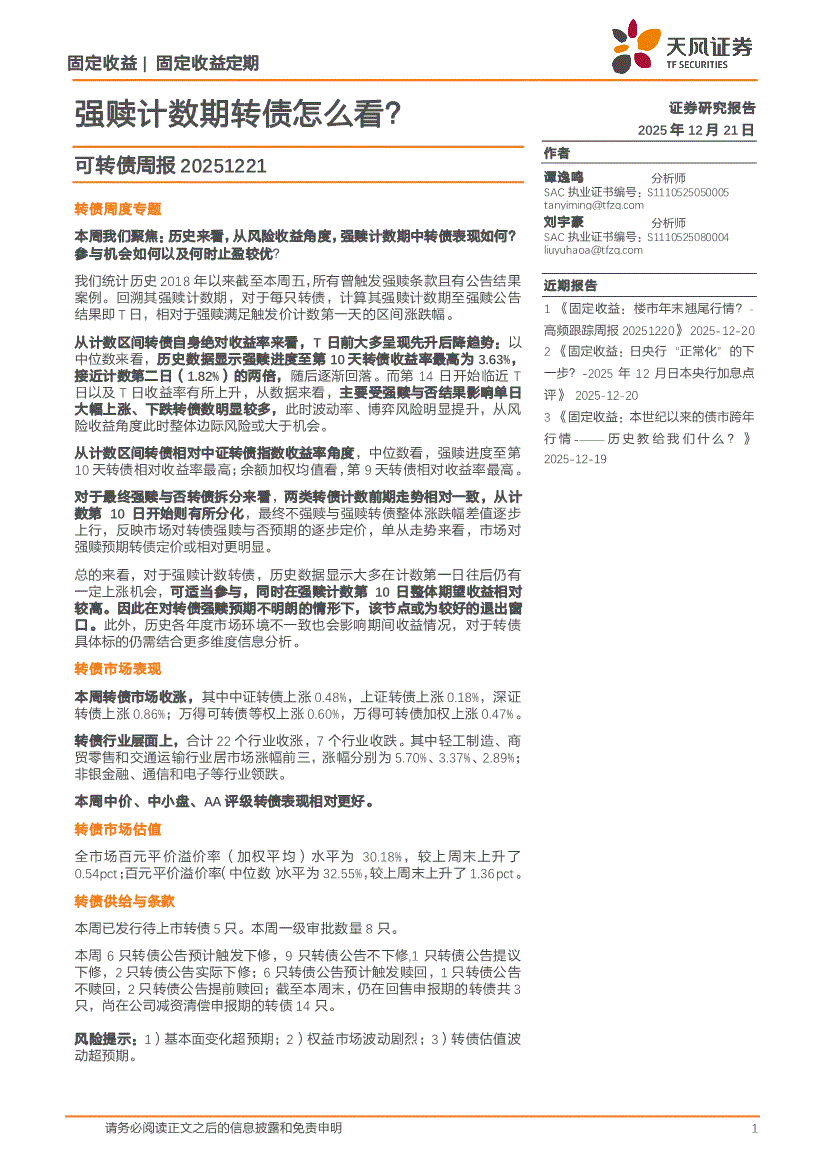 天风证券-可转债周报:强赎计数期转债怎么看?-251221