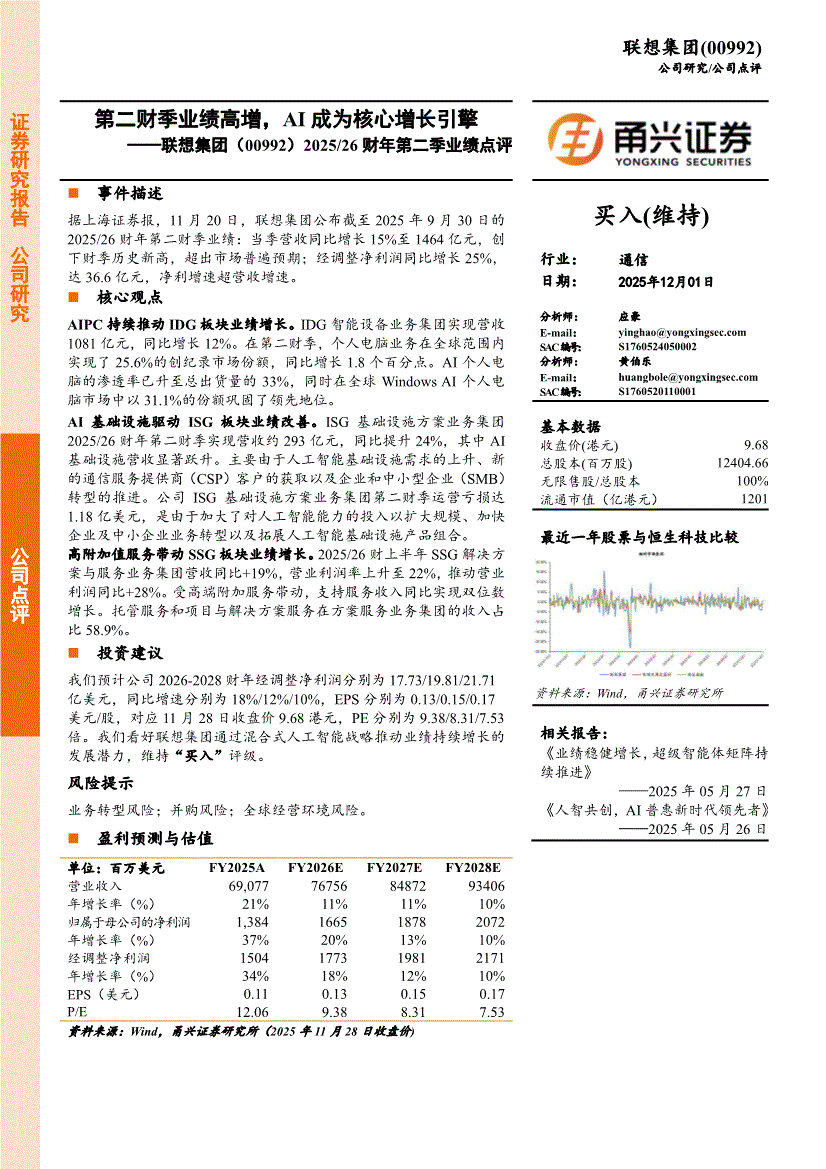 联想集团:甬兴证券-联想集团-0992.HK-2025/26财年第二季业绩点评:第二财季业绩高增,AI成为核心增长引擎-251201