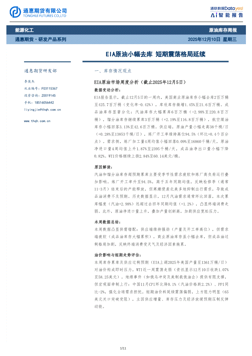 通惠期货-原油库存周报:EIA原油小幅去库,短期震荡格局延续-251210