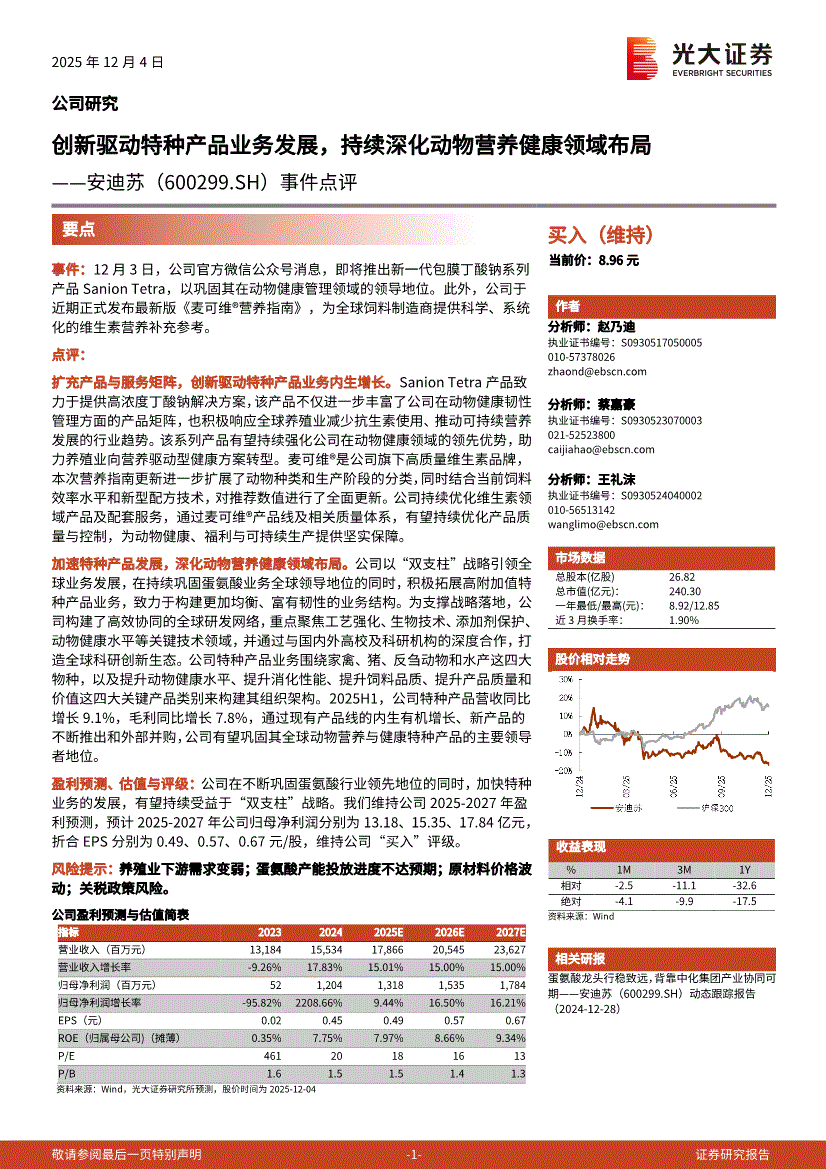安迪苏:光大证券-安迪苏-600299-事件点评:创新驱动特种产品业务发展,持续深化动物营养健康领域布局-251204