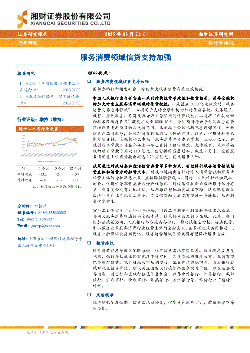 银行业:湘财证券-银行业周报:服务消费领域信贷支持加强-250921