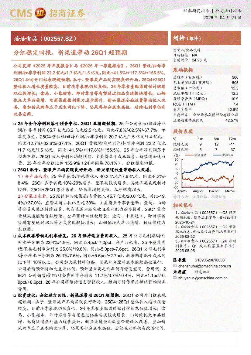 洽洽食品:招商证券-洽洽食品-002557-分红稳定回报,新渠道带动26Q1超预期-260421