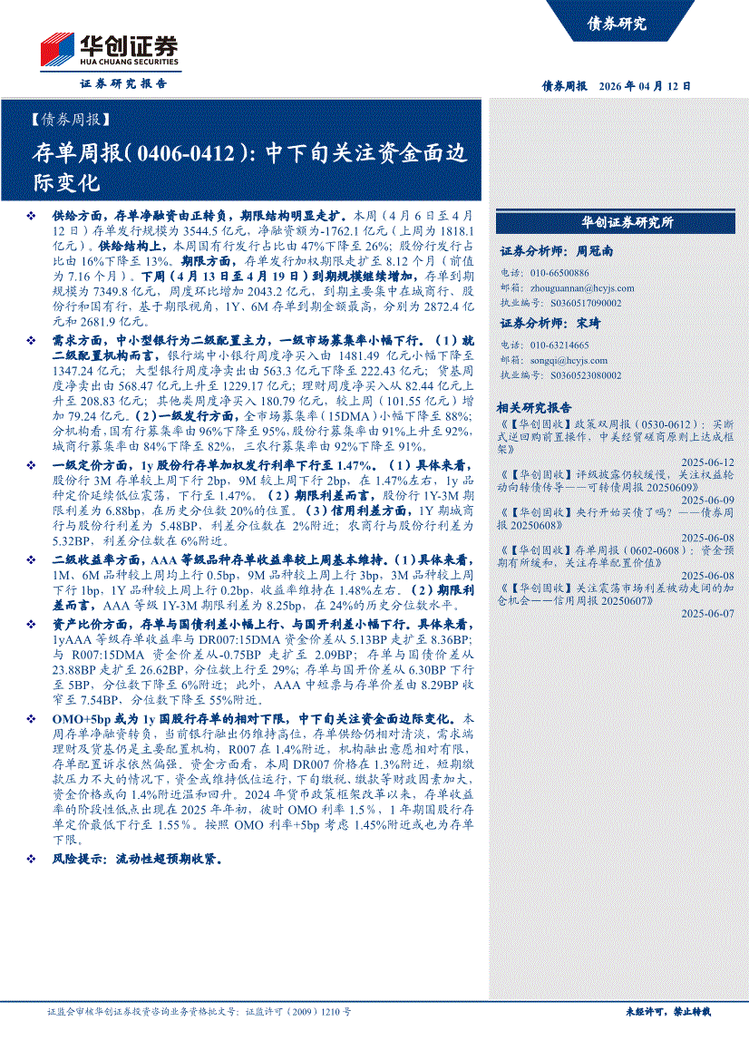 华创证券-【债券周报】存单周报:中下旬关注资金面边际变化-260412