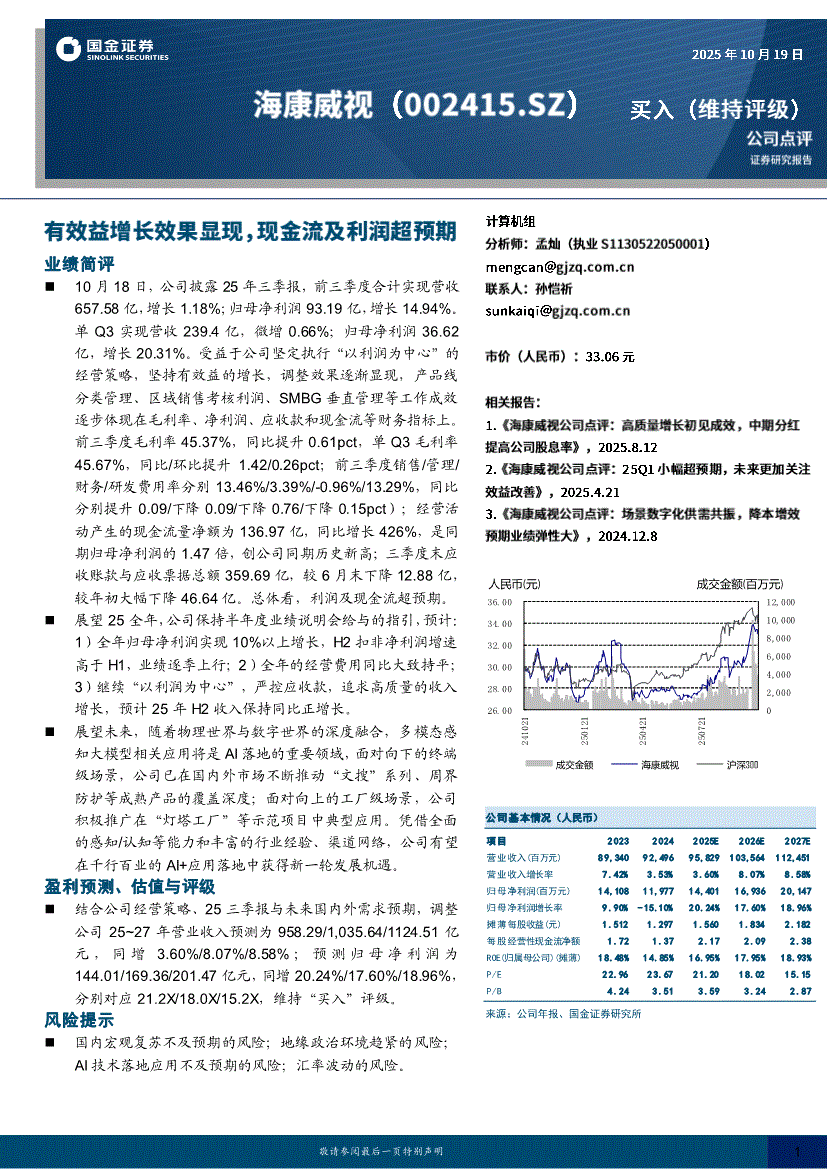 海康威视:国金证券-海康威视-002415-有效益增长效果显现,现金流及利润超预期-251019