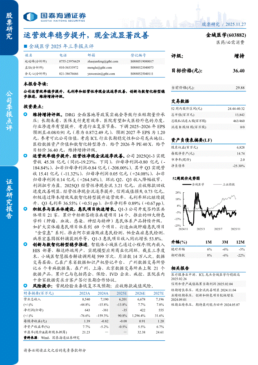 金域医学:国泰海通证券-金域医学-603882-2025年三季报点评:运营效率稳步提升,现金流显著改善-251127