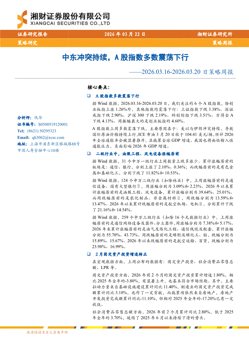 湘财证券-2026.03.16~2026.03.20日策略周报:中东冲突持续,A股指数多数震荡下行-260322