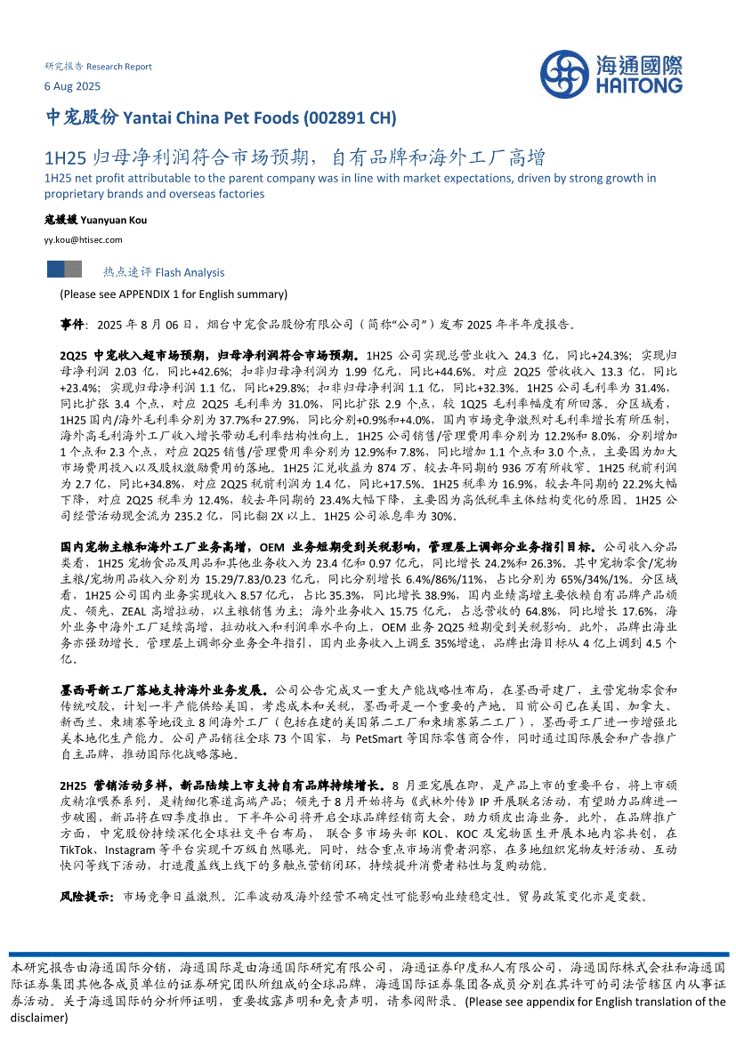 中宠股份:海通国际-中宠股份-002891-1H25归母净利润符合市场预期,自有品牌和海外工厂高增-250806