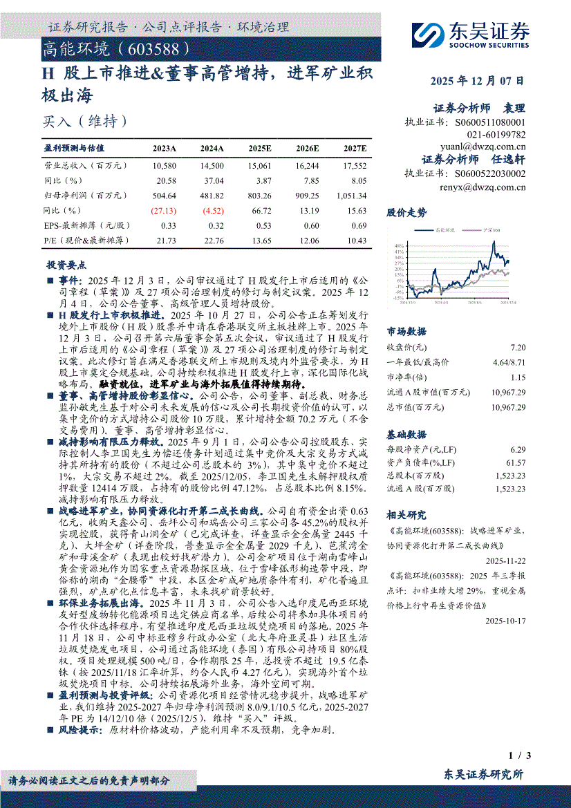 高能环境:东吴证券-高能环境-603588-H股上市推进&董事高管增持,进军矿业积极出海-251207