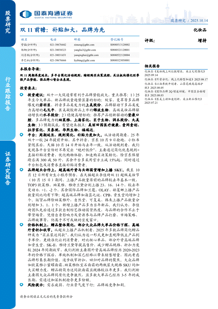 化妆品行业:国泰海通证券-化妆品行业双11前瞻:补贴加大,品牌为先-251014