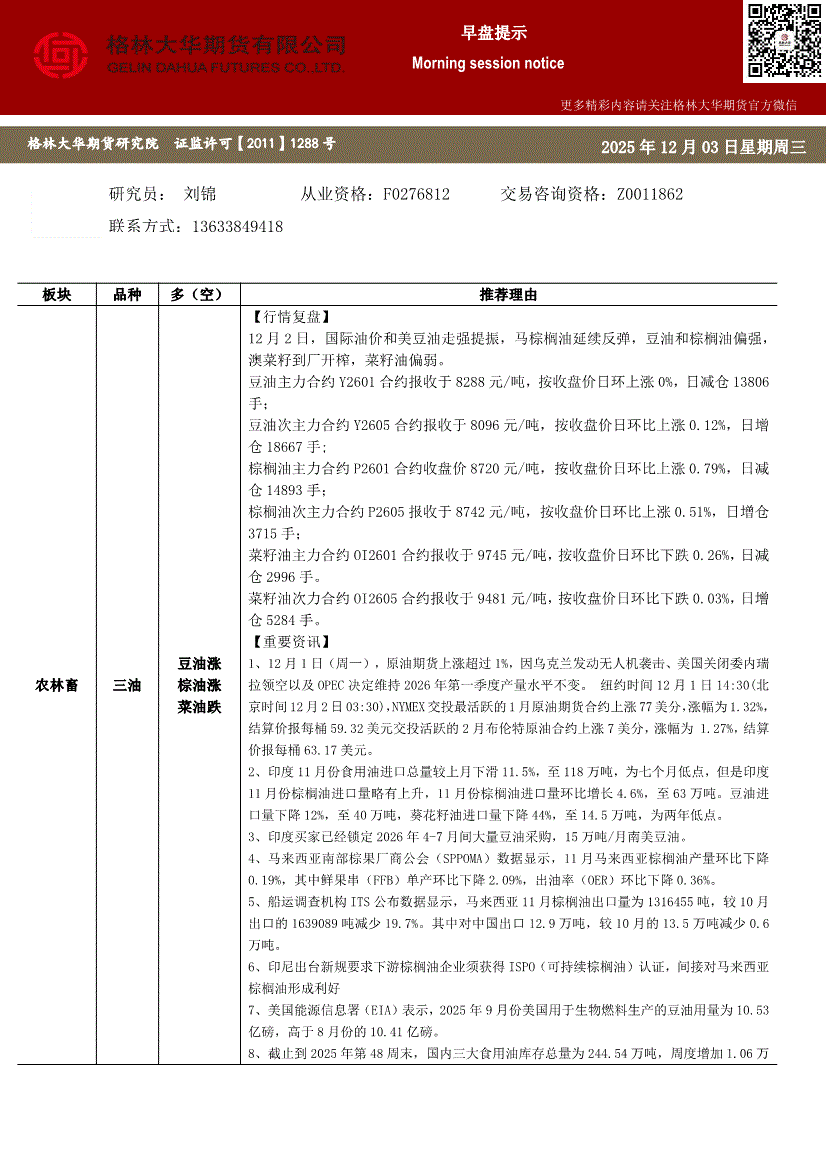格林大华期货-一周简评:油脂底部务实,走势节奏分化,成本抬升,蛋白中长期偏强-251115