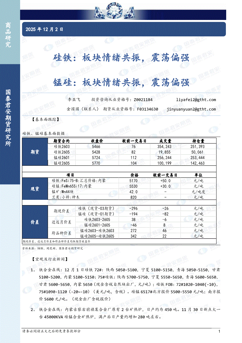 国泰君安期货-硅铁:现货价格短期坚挺,宽幅震荡,锰硅,现货价格短期坚挺,宽幅震荡-251212