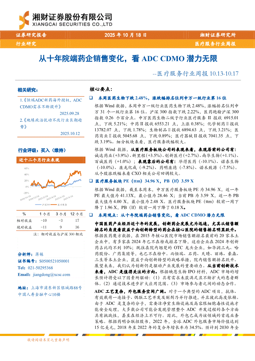 医疗服务行业:湘财证券-医疗服务行业周报:从十年院端药企销售变化,看ADC CDMO潜力无限-251018