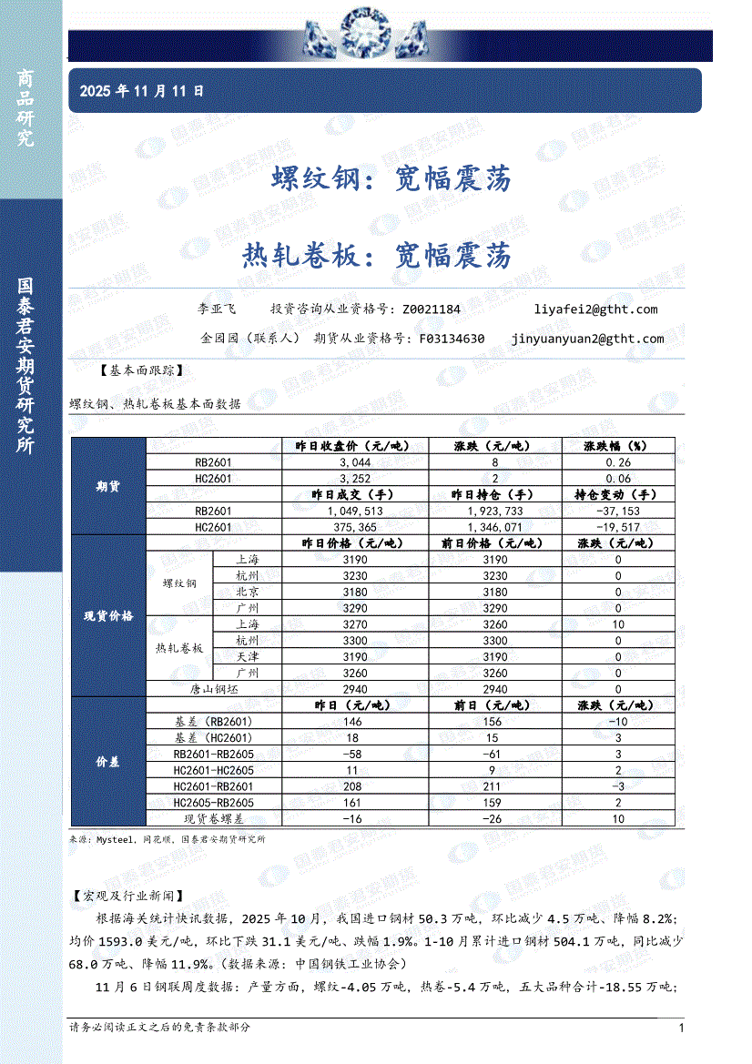 国泰君安期货-螺纹钢:宽幅震荡,热轧卷板,宽幅震荡-251111