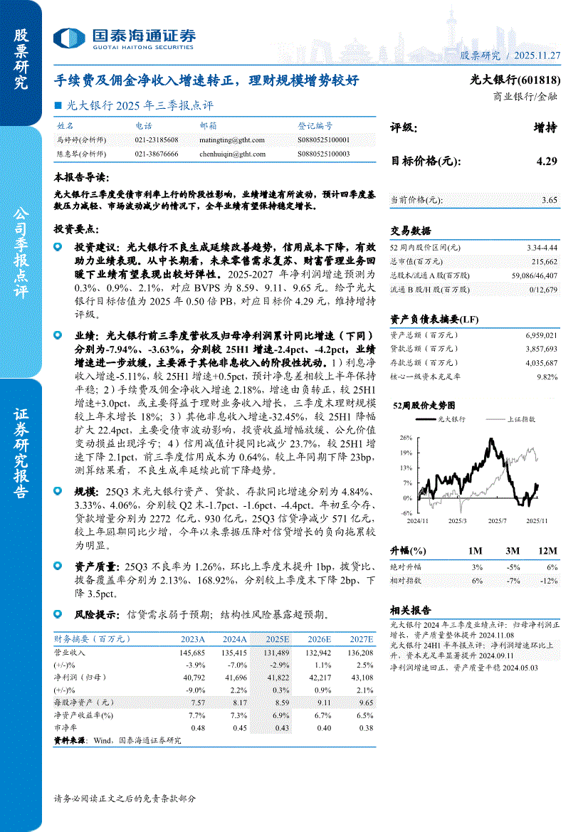 光大银行:国泰海通证券-光大银行-601818-2025年三季报点评:手续费及佣金净收入增速转正,理财规模增势较好-251127