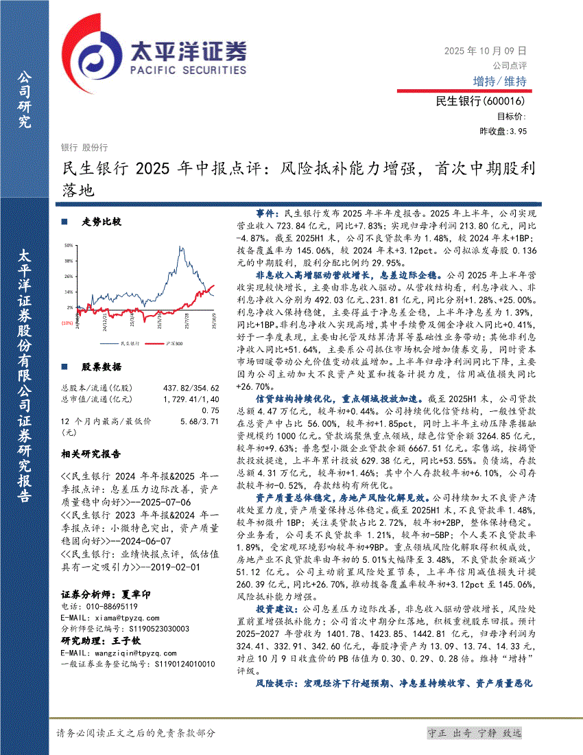 民生银行:太平洋证券-民生银行-600016-2025年中报点评:风险抵补能力增强,首次中期股利落地-251009