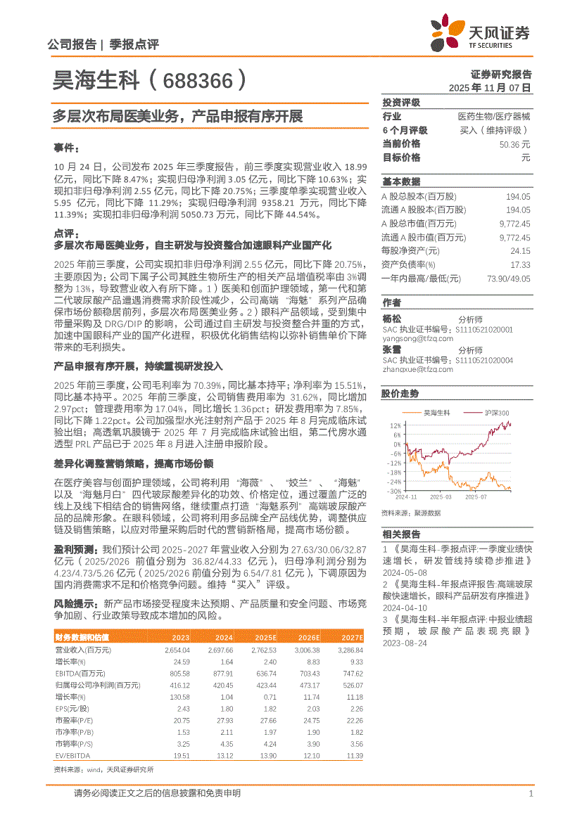 昊海生科:天风证券-昊海生科-688366-多层次布局医美业务,产品申报有序开展-251107