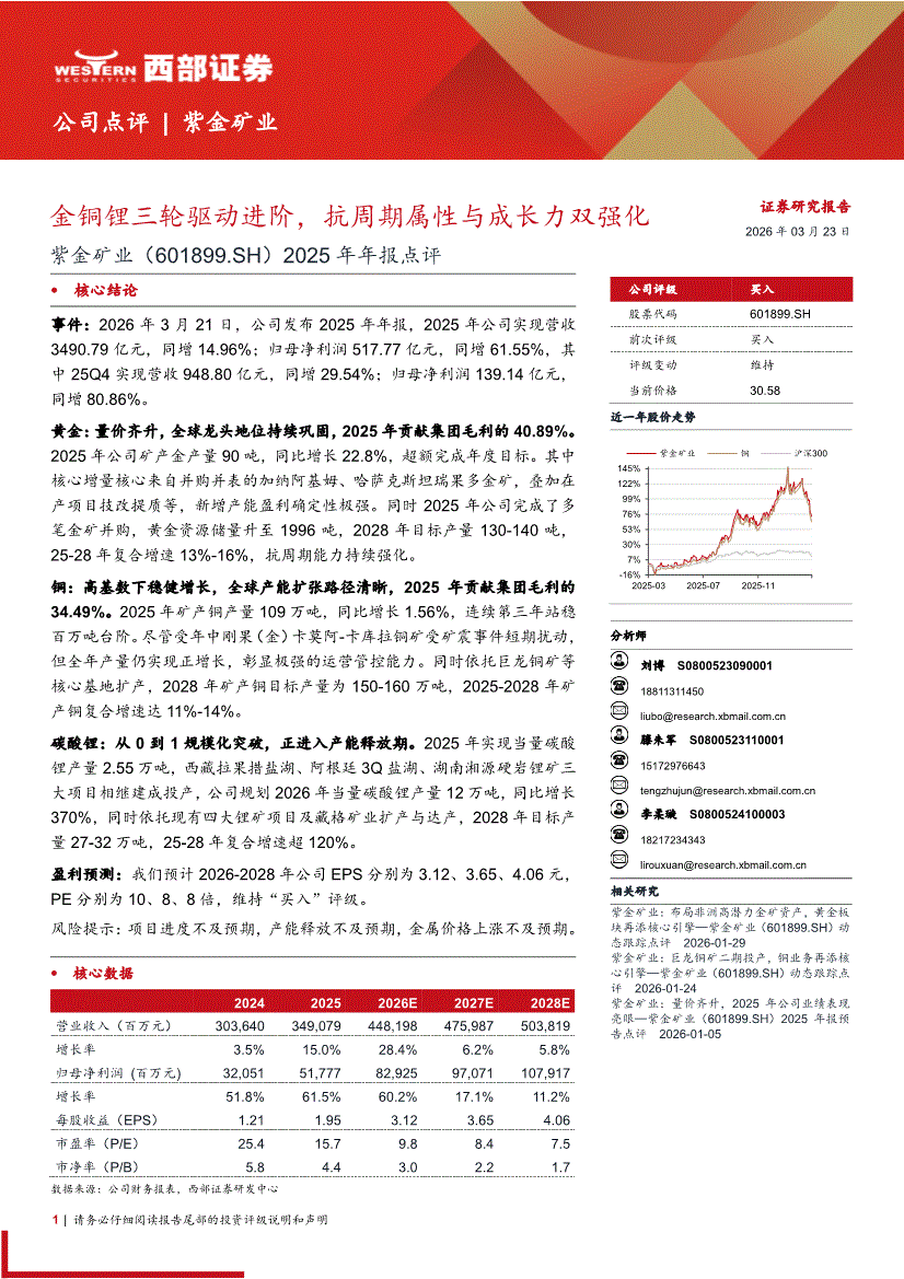 紫金矿业:西部证券-紫金矿业-601899-2025年年报点评:金铜锂三轮驱动进阶,抗周期属性与成长力双强化-260323