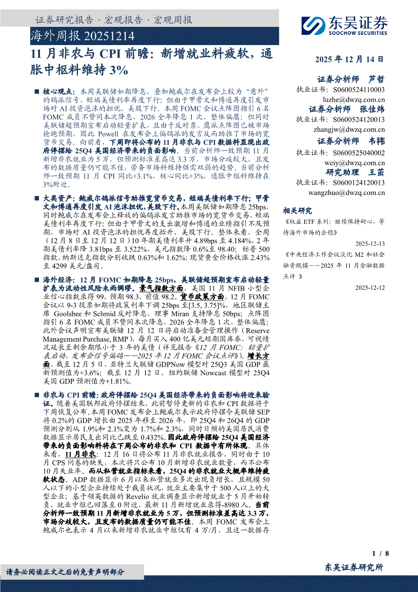 东吴证券-海外周报:11月非农与CPI前瞻,新增就业料疲软,通胀中枢料维持3%-251214