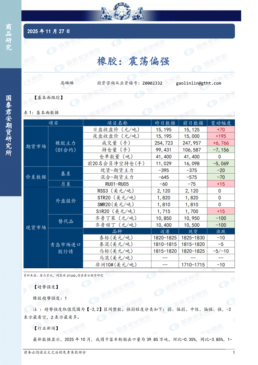 国泰君安期货-橡胶:震荡偏强-251127