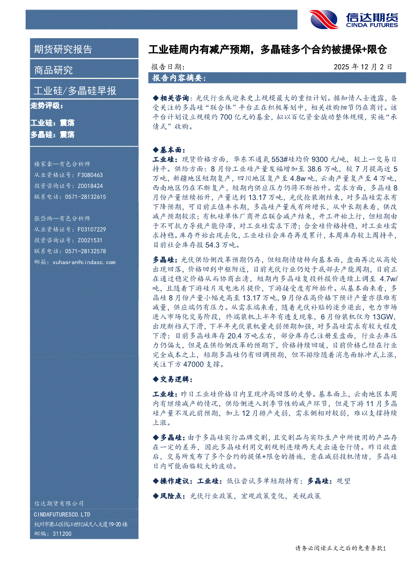 信达期货-工业硅/多晶硅早报:工业硅周内有减产预期,多晶硅多个合约被提保+限仓-251202