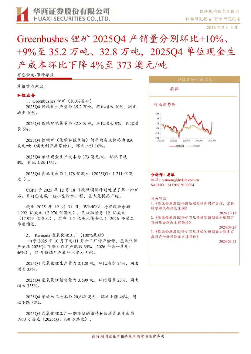 有色金属行业:华西证券-有色金属行业~海外季报:Greenbushes锂矿2025Q4产销量分别环比+10%、+9%至35.2万吨、32.8万吨,2025Q4单位现金生产成本环比下降4%至373澳元/吨-260204