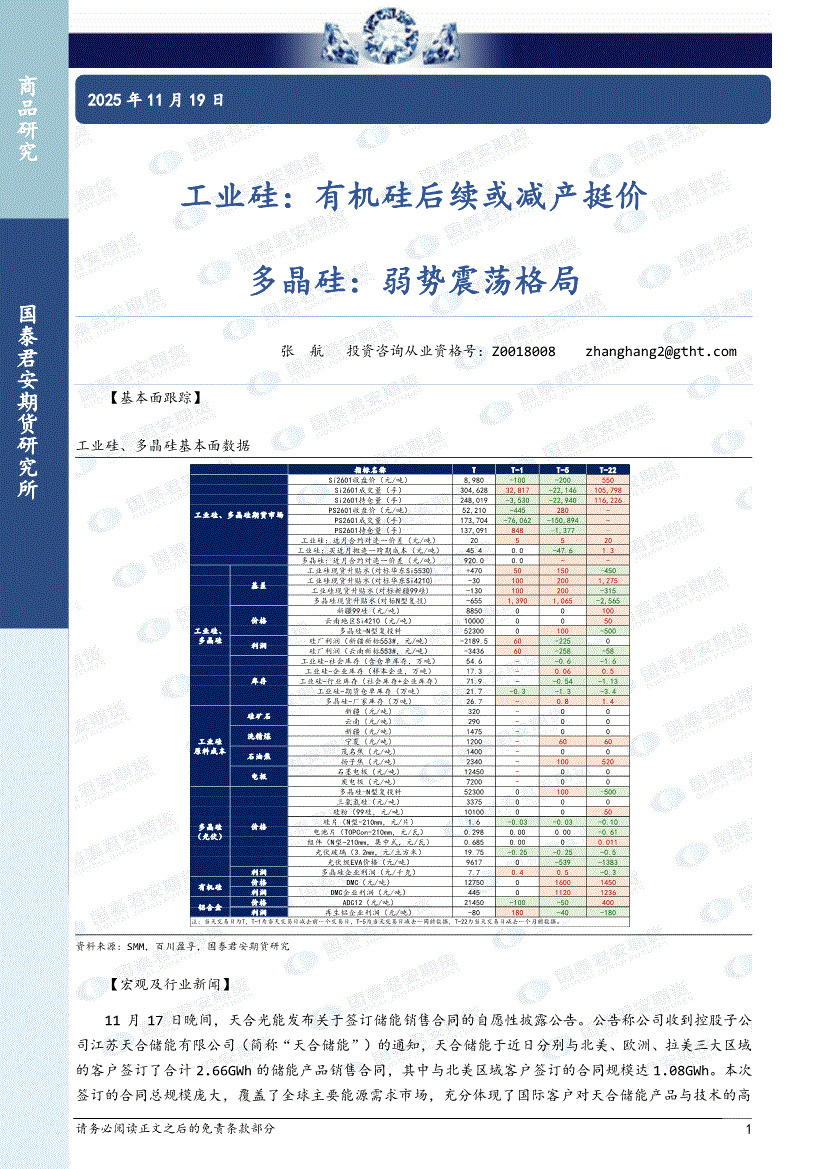国泰君安期货-工业硅:有机硅后续或减产挺价,多晶硅,弱势震荡格局-251119