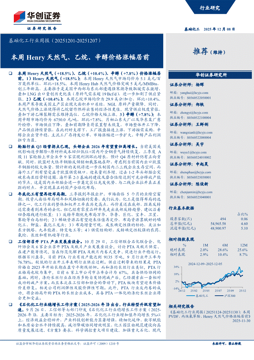 基础化工行业:华创证券-基础化工行业周报(20251201~20251207):本周Henry天然气、乙烷、辛醇价格涨幅居前-251208